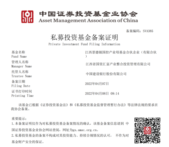 2022年4月7日,由景德鎮(zhèn)國(guó)控金融發(fā)展有限公司與江西省國(guó)控、昌江區(qū)國(guó)資合作發(fā)起組建的江西景德鎮(zhèn)國(guó)控產(chǎn)業(yè)母基金合伙企業(yè)(以下簡(jiǎn)稱“母基金”)在中國(guó)證券投資基金業(yè)協(xié)會(huì)成功備案,標(biāo)志著母基金正式進(jìn)入投資運(yùn)作階段。